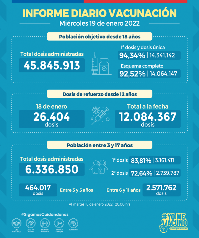 El Ministerio de Salud informa que con fecha de corte ayer martes 18 de enero, según los datos del Departamento de Estadística e Información de Salud, se han administrado 45.845.913 de dosis de vacuna contra COVID-19 en el país. Respecto de la población objetivo de 15.200.840 de personas, que considera a personas de 18 años […]