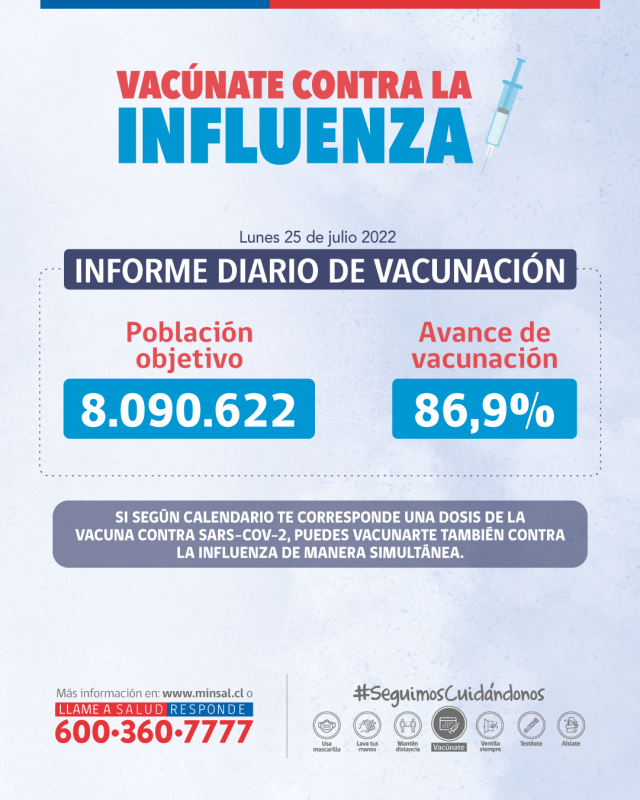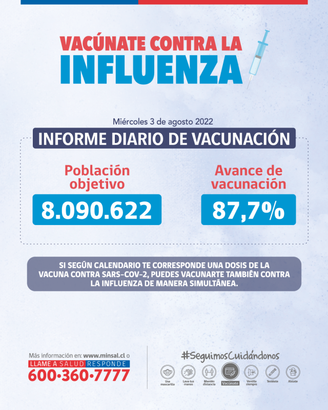 Durante la jornada de ayer fueron vacunadas 5.816 personas. El Ministerio de Salud informa que con fecha de corte martes 2 agosto, según los datos del Departamento de Estadística e Información de Salud, se han administrado 7.350.813 dosis de la vacuna contra la Influenza en el país. Respecto de la población objetivo de 8.090.622 personas […]